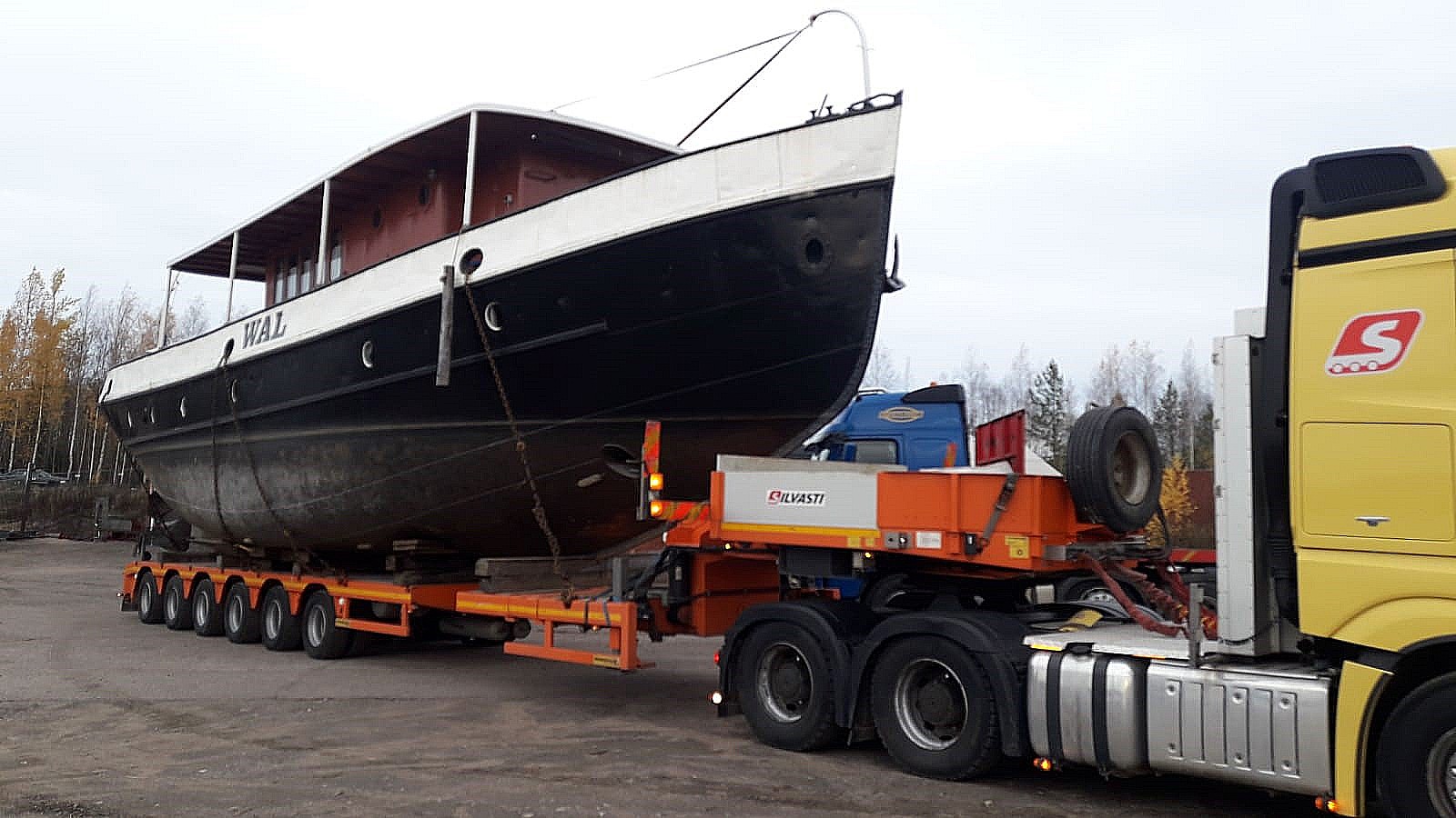 Our company had been involved in transportation of boat from Olkkola Shipyard in Jämsä to Saimaa waters. This transportation was planned and developed for several months, and was successfully completed this year. The implementation of this project required various types of special equipment including 2 cranes for unloading and launching the vessel. Total weight of cargo reached 50 tons and dimensions were 19,5x4,45x7 meters.