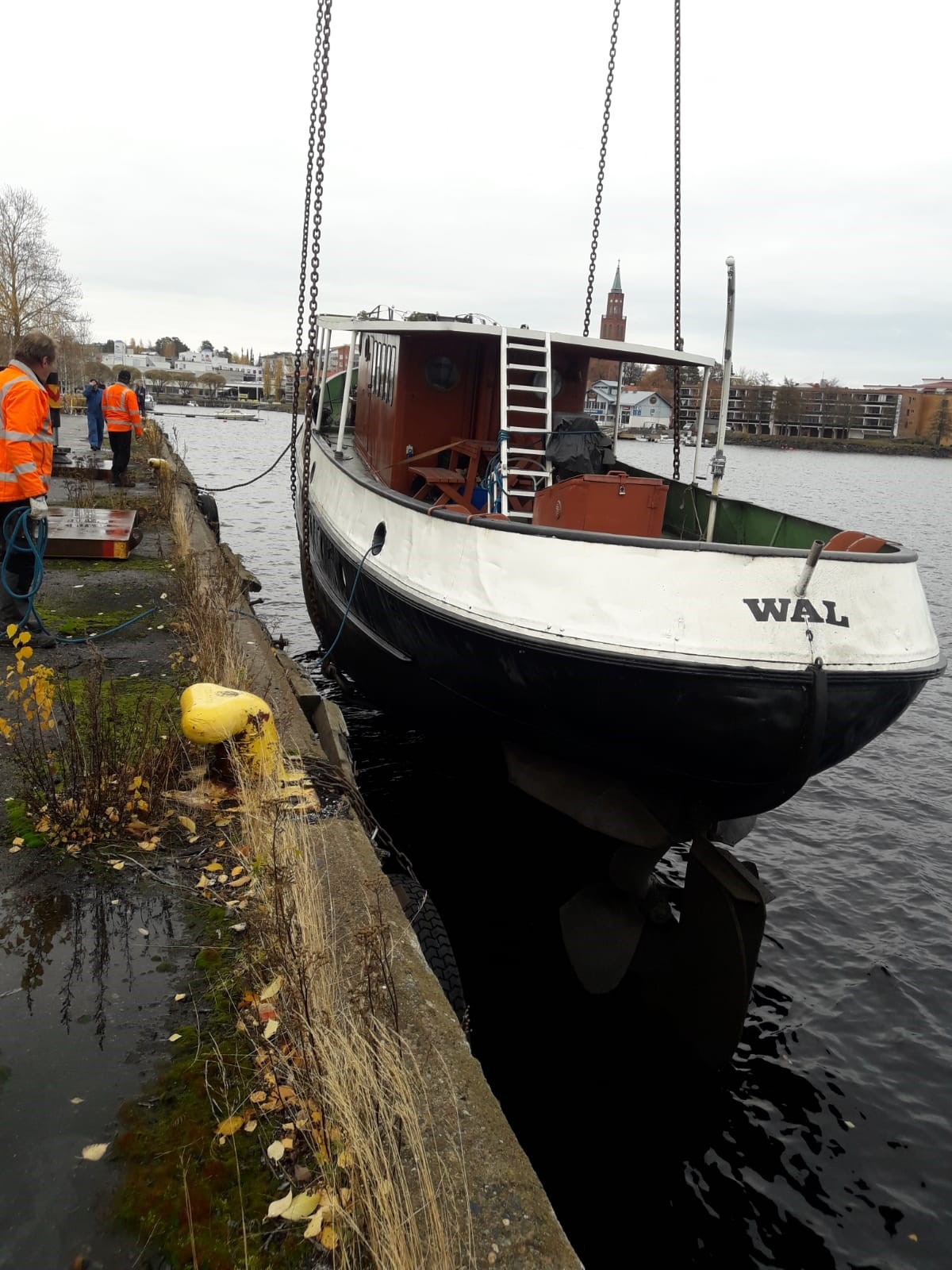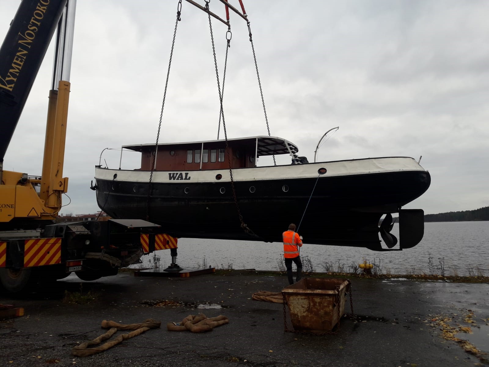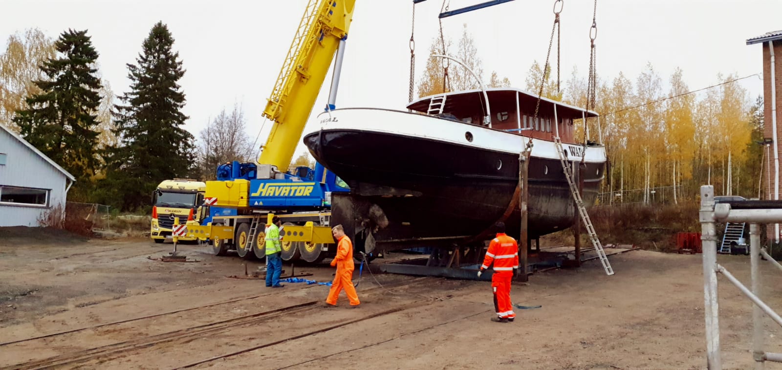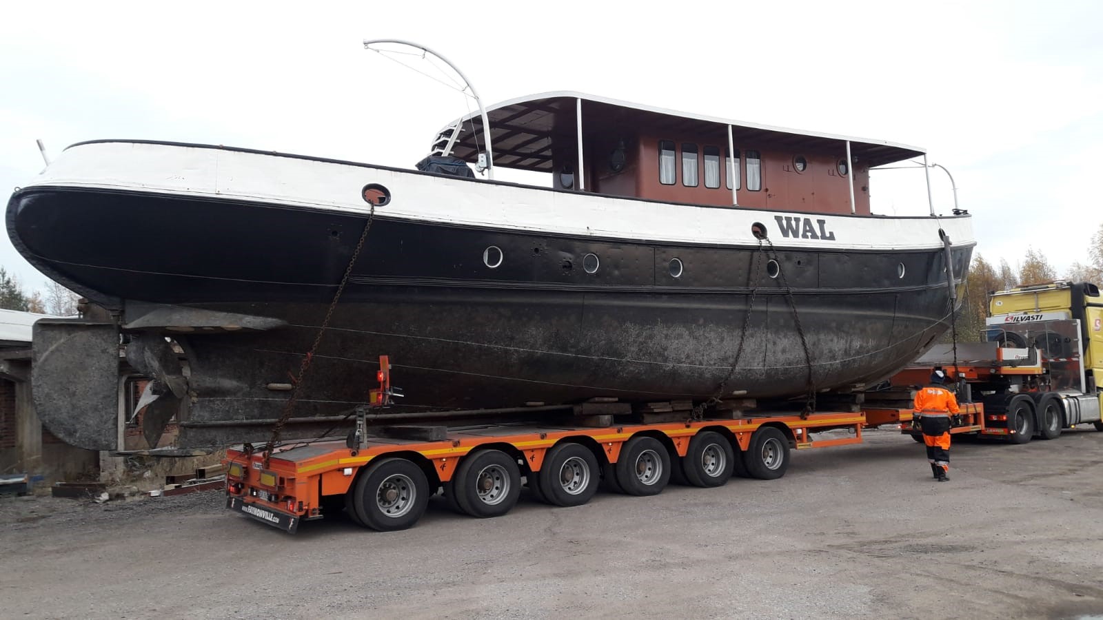 Our company had been involved in transportation of boat from Olkkola Shipyard in Jämsä to Saimaa waters. This transportation was planned and developed for several months, and was successfully completed this year. The implementation of this project required various types of special equipment including 2 cranes for unloading and launching the vessel. Total weight of cargo reached 50 tons and dimensions were 19,5x4,45x7 meters.
